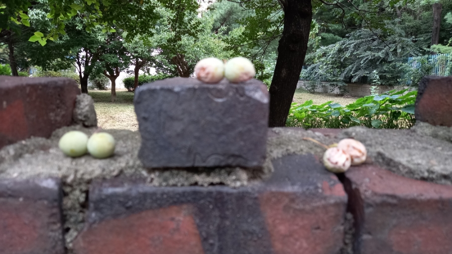 아직 익지도 않은 열매가 깨진 채 떨어져 있다