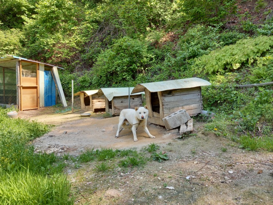 우리를 경계하는 개가 가장 먼저 손님을 맞이한다.