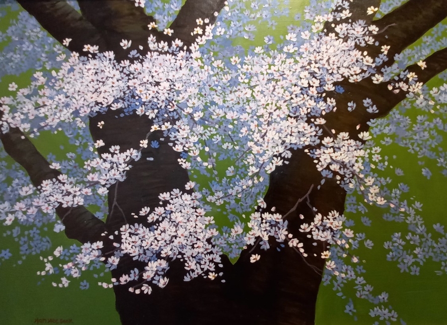 그림 / 한회숙 허공을 적시는 분홍 / 이현경 빈 가지에서 숨을 죽이고 있다가 꽃 피는 속도로 우리들의 눈을 끌어모으고 있다 허공을 적시는 분홍 꽃잎이 수면에 접사되어 호수 둘레에 웃음이 떠 있다 벚꽃 무리를 어루만지는 바람의 손 화심이 머문 곳에 갓 나온 향기가 나비를 두근거리게 한다 바람을 열고 수만 개의 이야기로 부푸는 벚꽃을 무수히 읽고 있으면 저 공중에 어린 체온이 두근두근 마음을 휘감는다 이현경 시집 / 맑게 피어난 사색