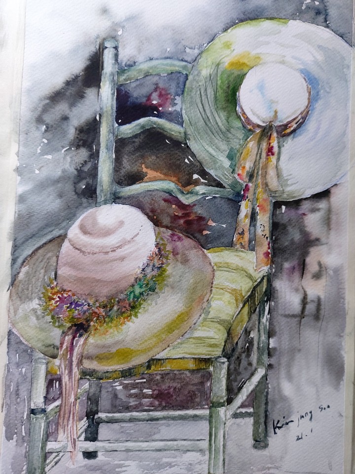 그림 : 김 정 수 두 마음 / 이 효 외출하고 돌아왔다. 붉은색 원피스도 모자도 벗는다 모자를 의자 모서리에 걸었다 양파 껍질을 벗기면 눈물이 난다 인간의 높고자 하는 욕망 틀어논 수도꼭지 같다 하이힐만큼이나 꽃이 달린 모자만큼이나 내 안에 꽈리를 틀고 춤추는 너 나를 쳐다보는 수많은 신선들 밤에 빛났던 불빛들 새벽 자동차 바퀴에 깔린 시간들 모자 속에 숨었던 새가 둥지에서 작은 깃털이 되는 순간이다 내일 아침 다시 모자를 쓰고 나갈까 아니, 다시는 모자를 쓰지 말자 두 마음이 키스를 한다 바벨탑을 오르는 모자들 발자국의 웅성거림 내일도 욕망은 엘리베이터를 기다린다.