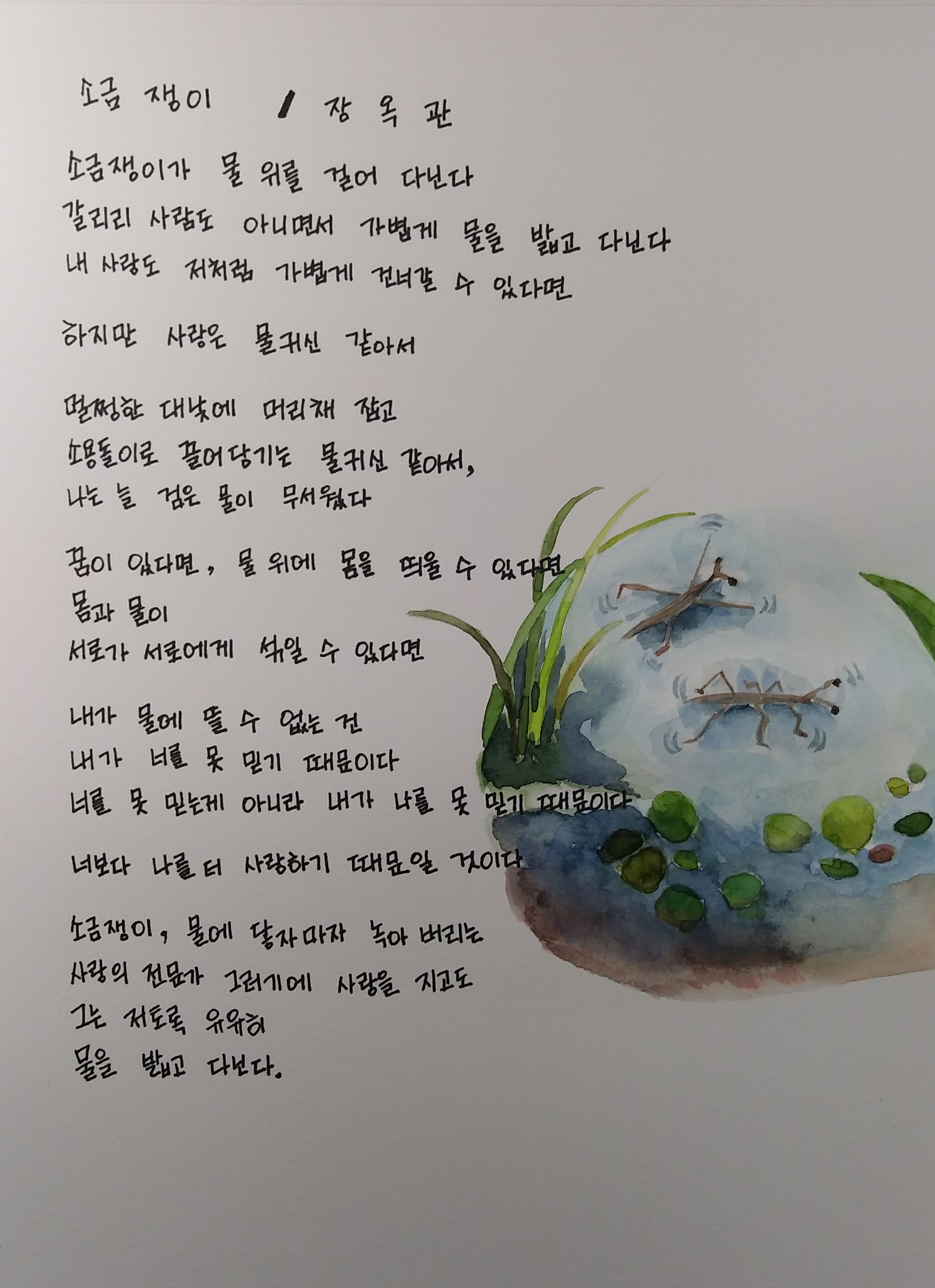 그림 / 장문자 객짓밥 / 마경덕 하나님은 저 소금쟁이 한 마리를 물 위에 띄우려고 다리에 촘촘히 털을 붙이고 기름칠을 하고 수면에 표면장력을 만들고 소금쟁이를 먹이려고 죽은 곤충을 연못에 던져주고 물위에 넘어지지 말라고 쩍 벌어진 다리를 네 개나 달아주셨다 그래도 마음이 안 놓여 연못이 마르면 다른 데 가서 살라고 날개까지 주셨다 우리 엄마도 서울 가서 밥 굶지 말고, 힘들면 편지하라고 취직이 안 되면 남의 집에서 눈칫밥 먹지 말고 그냥 집으로 내려오라고 기차표 한 장 살 돈을 내 손에 꼭 쥐여주었다 그 한마디에 객짓밥에 넘어져도 나는 벌떡 일어섰다 마경덕 시집 / 악어의 입속으로 들어가는 밤