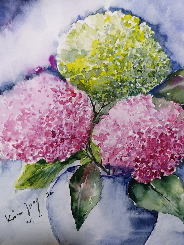 그림 : 김 정 수 수국 형제 / 이 효 마당 한편에 동자승 닮은 수국이 피었다 하늘길 따라가신 아버지 마당에 달덩이 닮은 수국 남겨 놓으셨다 아버지 살아생전 몰랐다 붉은빛으로 핀 수국 하얀 빛으로 핀 수국 서로의 뒷모습만 바라보는 형제들 어머니가 쓰러진 그날 삼 형제는 함께 비를 맞으며 어머니를 업고 달렸다 둥근 우산 닮은 수국들 처음으로 서로를 바라보았다 아버지 얼굴 닮은 수국들 어쩌면 아버지의 마지막 편지 소낙비가 내려도 머리 맞대고 살아라 잃은 것이 있어도 웃으면서 살아라 은은한 향기 서로 보태며 살아라 아버지의 마지막 편지가 마당 한가득 피었다.